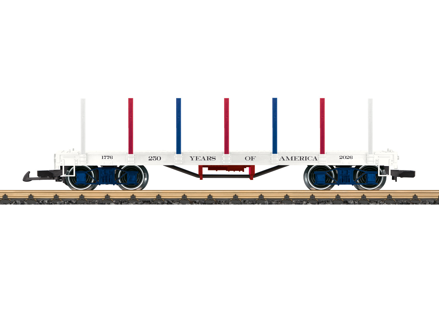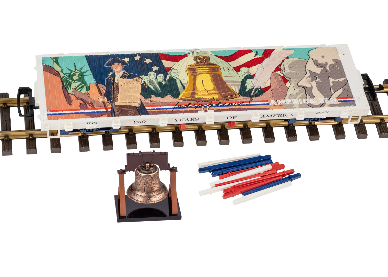 2026 wiederholt sich die Unterzeichnung der Unabhängigkeitserklärung in Amerika. Zu diesem Jubiläum bringt LGB ein Sonderwagen heraus. Flachwagen in den US-Farben gestaltet. Wagenboden aufwendig mit verschiedenen Bilder zum Thema Unabhänigkeit bedruckt. Passende Beladung der Liberty Bell. Beiligende Rungen in den US-Farben. Metallradsätze. Länge über Kupplung 42 cm.