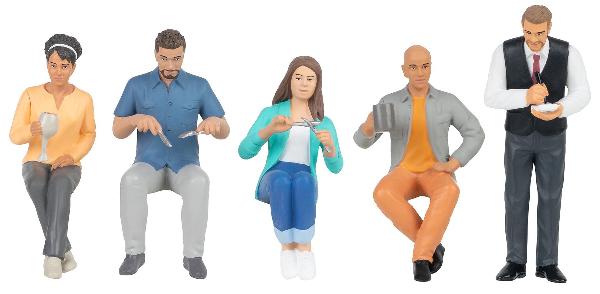 Essen, trinken, genießen! Fünf moderne Restaurantgäste und ein aufmerksamer Kellner bringen authentisches Leben in Ihre Szenen. Zwei Gäste greifen bereits zu Messer und Gabel, während eine Frau entspannt ihr Getränk genießt. Ein weiterer Gast lehnt sich zurück mit einem Bierkrug in der Hand. Der Kellner nimmt mit freundlichem Lächeln die Bestellung auf. Perfekt geeignet zur Gestaltung von Restaurants, Straßencafés oder Biergärten – für realistische Alltagsszenen in Ihrer Modellwelt.
