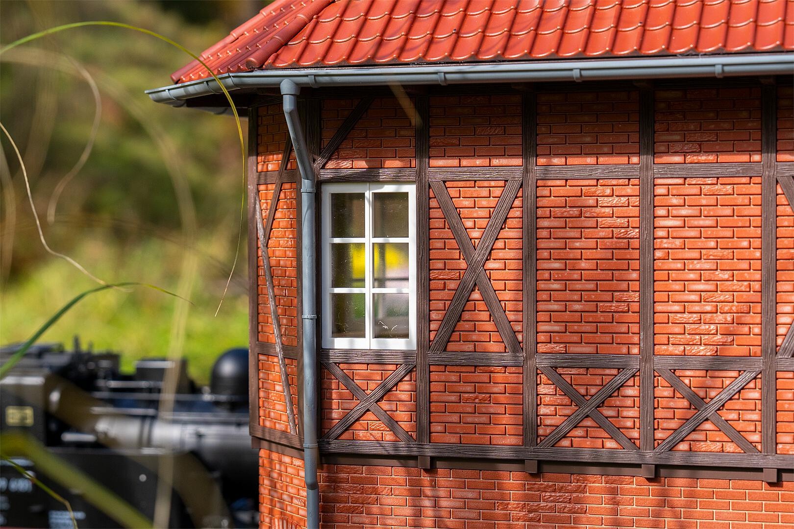 Dieses detailgetreue Stellwerk ist eine Nachbildung im Stil des Historismus, wie er für die eindrucksvollen Eisenbahnbauten des späten 19. und frühen 20. Jahrhunderts typisch war. Die Kombination aus robustem Backsteinmauerwerk im Erdgeschoss und dekorativem Fachwerk im Obergeschoss verleiht dem Gebäude seinen unverwechselbaren Charakter. Das markante, spitz zulaufende Mansardendach mit Fußwalm und filigranen Dachspitzen rundet die historische Optik ab und macht das Stellwerk zu einem echten Blickfang auf jeder Anlage. Große Fenster geben den Blick auf die umfangreiche Ausgestaltung des Hebelwerks im Inneren frei