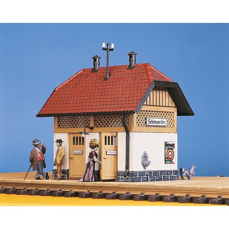 Separates Toilettenhäuschen, passend zum Bahnhof »Schönweiler« (Art. 330901) mit Krüppelwalmdach und beweglichen Türen. Grundplatte (Art. 330904) wird zusätzlich benötigt.